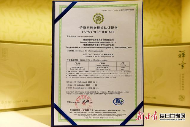 祥宇橄欖油獲編號(hào)為001的我國(guó)第一張?zhí)丶?jí)初榨橄欖油認(rèn)證證書