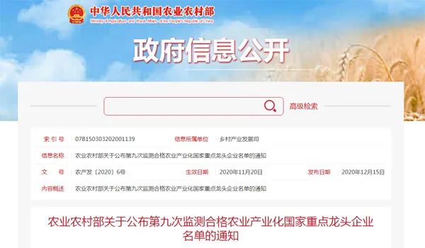 12月15日,農(nóng)業(yè)農(nóng)村部發(fā)布《關(guān)于公布第九次監(jiān)測合格農(nóng)業(yè)產(chǎn)業(yè)化國家重點龍頭企業(yè)名單的通知》。