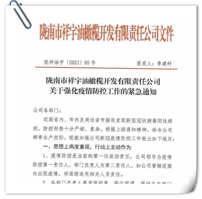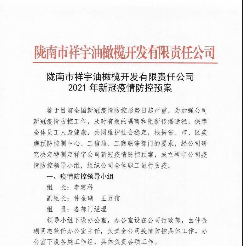 確保今年油橄欖鮮果收購工作圓滿完成,隴南市祥宇油橄欖開發(fā)有限責任公司根據(jù)實際情況及時成立了疫情防控小組,