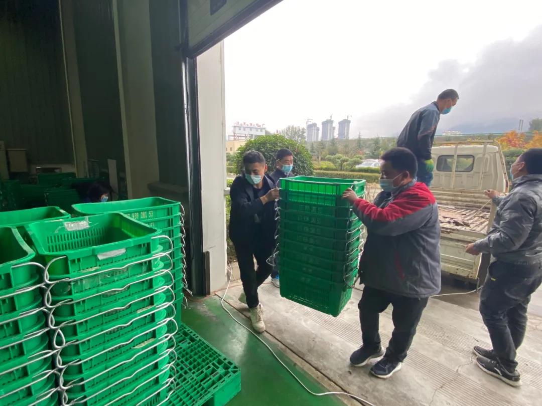 鮮果收購現(xiàn)場,所有工作人員都佩戴好口罩,過磅、驗果、卸車、入庫等工作在有序進行。