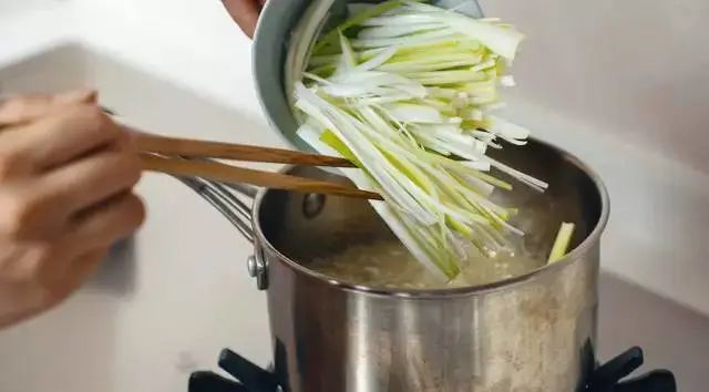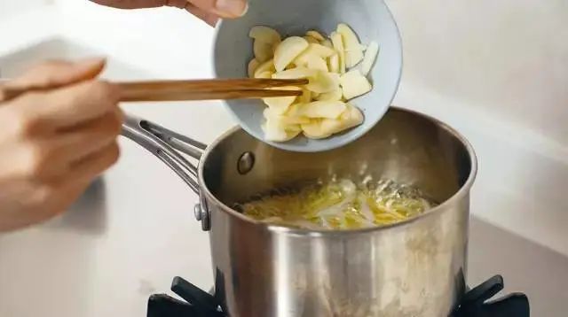 待竹筷周圍起泡后,依次放入切好的蔥、姜、蒜。